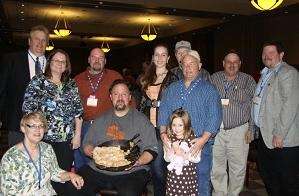 Pictured at the event are Board Members: John Morton, Sally Churchill, Randy Kleven, Ed Reible along with several former Board Members and supporters. Holding the pie is the creator of the sweet treat, Chef Robert Gamble.